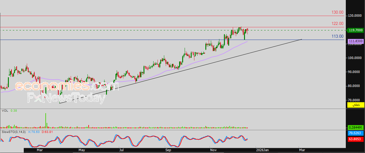 لهذا تشير توقعاتنا إلى صعود سعر السهم خلال تداولاته اللحظية القادمة، خاصة في حالة اختراقه للمقاومة الحالية 122.00 ريال، ليستهدف بعدها مستوى المقاومة التالي عند سعر 130.00 ريال.