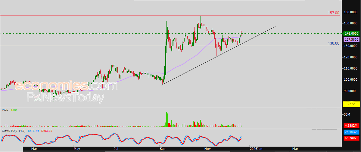 لذلك تشير توقعاتنا إلى صعود سعر السهم خلال تداولاته القادمة، طيلة ثبات مستوى الدعم 130.00 دينار، ليستهدف مستوى المقاومة المحوري 157.00 دينار.