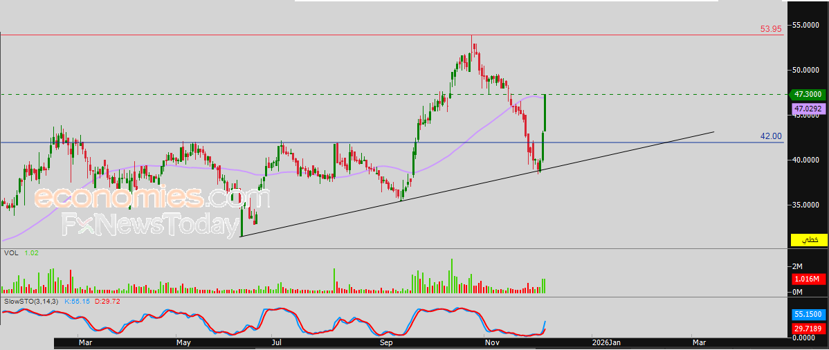 لذلك فتوقعاتنا تشير إلى صعود سعر السهم خلال تداولاته القادمة، طيلة استقراره اعلى الدعم 42.00 ريال، ليستهدف مستوى المقاومة المحوري 53.95 ريال.