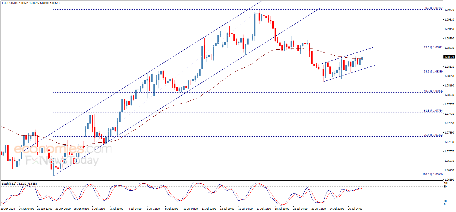 يظهر سعر اليورو مقابل الدولار ميلاً صاعداً طفيفاً ليقترب من اختبار المقاومة المحورية 1.0880$، مع ملاحظة أن مؤشر ستوكاستيك يفقد عزمه الإيجابي ليصل إلى مناطق التشبع في الشراء، بينما يشكّل المتوسط المتحرك 50 ضغط سلبي مستمر أمام السعر.