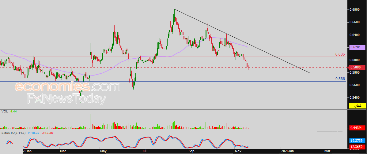 لذلك فتوقعاتنا تشير إلى هبوط سعر السهم خلال تداولاته القادمة، طيلة ثبات مستوى المقاومة 0.605 ريال، ليستهدف مستوى الدعم 0.566 ريال.