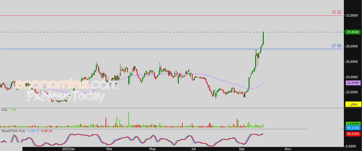لهذا تشير توقعاتنا إلى صعود سعر السهم خلال تداولاته القادمة، طيلة ثبات مستوى الدعم 27.66 ريال، ليستهدف أولى مستويات المقاومة عند سعر 32.00 ريال.
