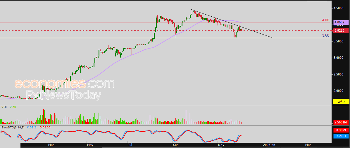 لهذا تشير توقعاتنا إلى هبوط سعر السهم خلال تداولاته القادمة، طيلة ثبات مستوى المقاومة 4.06 ريال، ليستهدف مستوى الدعم المحوري 3.60 ريال.