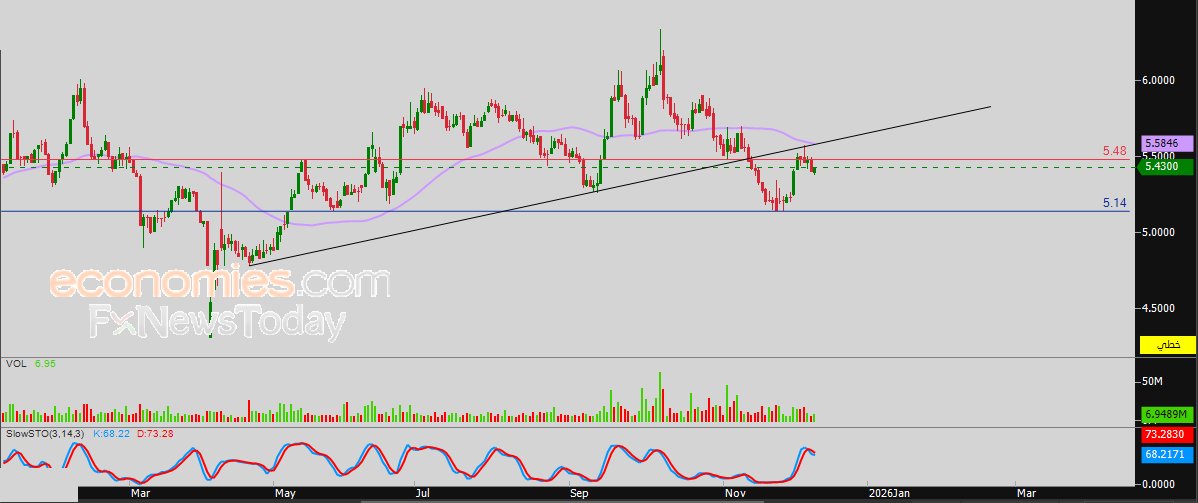 لهذا تشير توقعاتنا إلى انخفاض سعر السهم خلال تداولاته القادمة، طيلة ثبات مستوى المقاومة 5.50 درهم، ليستهدف مستوى الدعم 5.15 درهم.