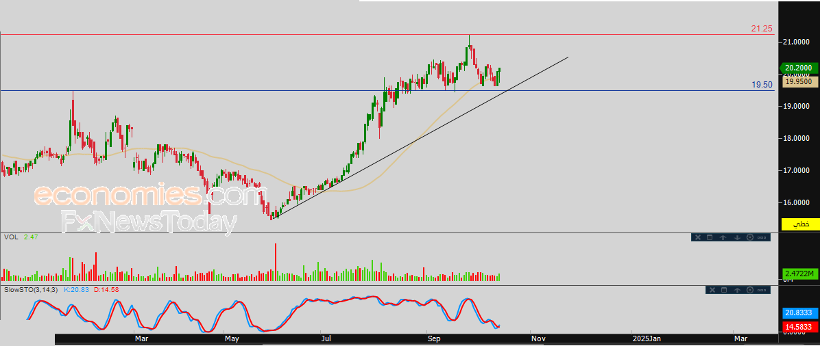 لذلك نحن نتوقع المزيد من الصعود لسعر السهم خلال تداولاته القادمة، طيلة ثبات مستوى الدعم 19.50، ليستهدف مستوى المقاومة المحوري 21.25.