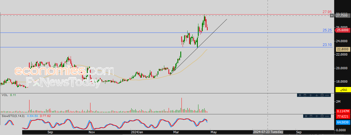 لذلك نحن نرجح عودة صعود سعر السهم خلال تداولاته القادمة، خاصة طوال استقراره فوق مستوى 25.25، ليستهدف مستوى المقاومة 27.95.
