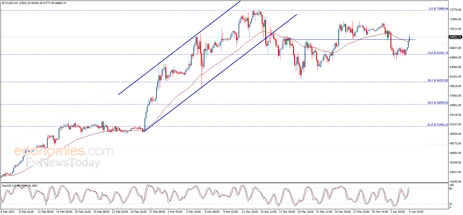 اندفع سعر البتكوين (BTCUSD) صعوداً بشكل قوي ليخترق مستوى 68200.00$ ويستقر فوقه، ليوقف السيناريو السلبي المقترح اليوم ويتجه نحو استعادة الاتجاه الرئيسي الصاعد من جديد، ممهداً الطريق أمام التوجه نحو 73700.00$ كهدف رئيسي تالي.