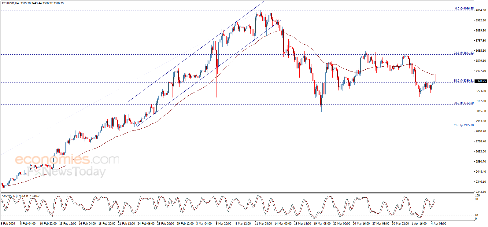 يتداول سعر الإيثريوم (ETHUSD) بإيجابية ليخترق مستوى 3360.31$ ويحاول الثبات فوقه، ليقدّم إشارات على التوجه لإيقاف التصحيح الهابط والعودة إلى المسار الصاعد، ونحتاج لمراقبة الإغلاق اليومي بالنسبة لهذا المستوى لتأكيد الوجهة التالية بشكل أدق، مع الإشارة إلى أن تأكيد الاختراق سيدفع السعر لتحقيق مكاسب تبدأ عند 3641.82$.