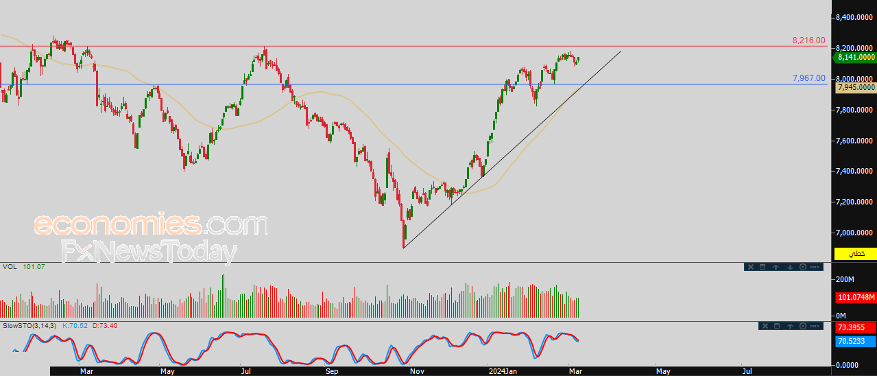 نطاق التداول المتوقع لهذا اليوم ما بين مستوى الدعم 8,000.00 ومستوى المقاومة 8,216.00.