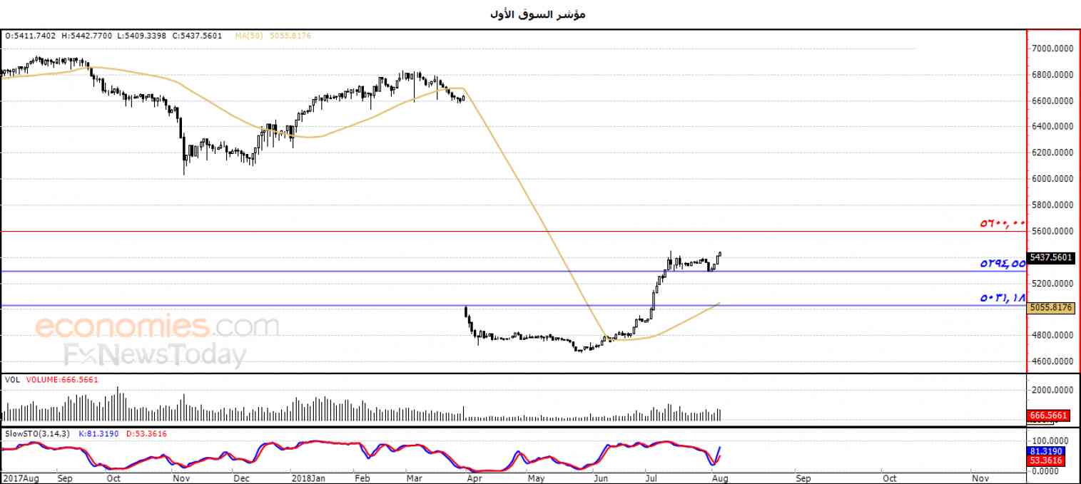 واصل مؤشر السوق الأول ارتفاعه بتداولاته الأخيرة على المستويات اللحظية ؟، وذلك في ظل وصول مؤشرات القوة النسبية لمناطق شديدة التشبع بعمليات البيع ، بصورة مبالغ فيها مقارنة بحركة السعر في الأعلى ، مع سيطرة الاتجاه التصحيحي الصاعد على المدى القصير ، مع استمرار الدعم الإيجابي للمتوسط المتحرك البسيط لفترة 50 يوماً السابقة ، ليحقق بذلك أرباحاً جديدة بلغت نسبتها 0.51% بما يعادل 27.51 نقطة .