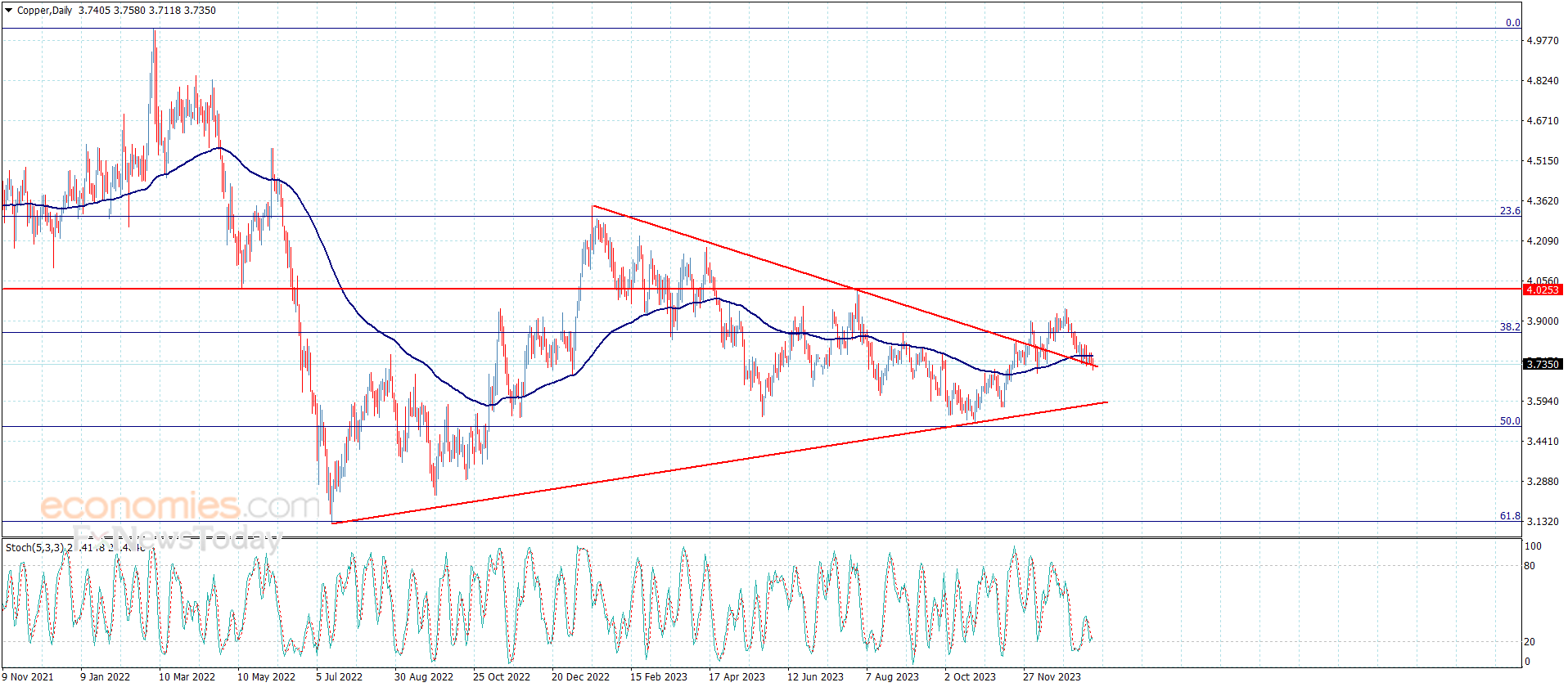 استمر سعر النحاس بالتذبذب حتى هذه اللحظة قرب الدعم الأولي المستقر عند 3.7400 متأثرا بالضغوط السلبية المتكررة والناتجة عن الاستقرار المتكرر دون الحاجز المتمثل بمستوى 3.8500 إضافة لتقديم المؤشرات الرئيسية للعزم السلبي تحديدا بمحاولة تسلل مؤشر ستوكاستيك نحو مستوى تشبع البيع.