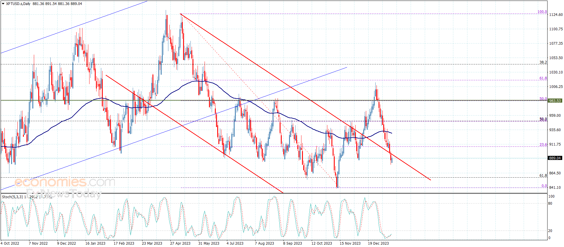 حقق سعر البلاتين كسر واضح لمستوى 898.00 مقدما إغلاق سلبي ضمن محاور القناة الهابطة الموضحة بالرسم المرفق ليؤكد تأثره حاليا بالمسار السلبي ولنلاحظ ملامسته للهدف الأول المستقر قرب 880.00.