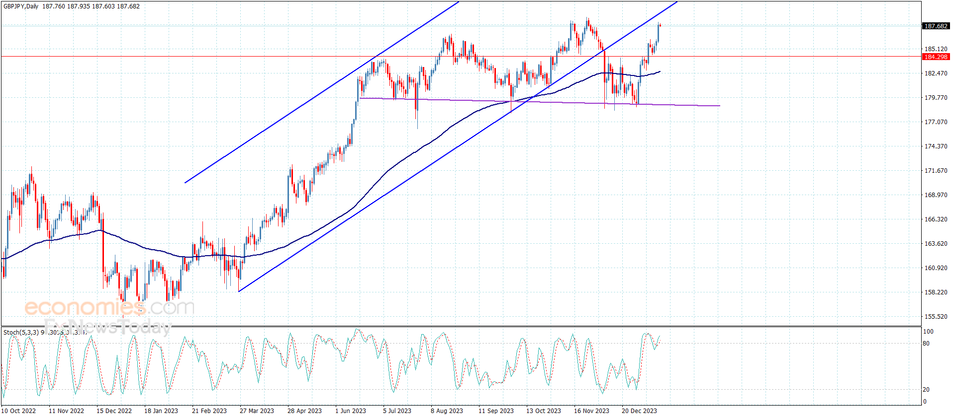 استغل سعر الزوج الضغوط الإيجابية الناتجة عن وصول مؤشر ستوكاستيك نحو مستوى تشبع الشراء مشكلا بذلك اندفاع صاعد قوي ليحقق العديد من الأهداف الإيجابية المقترحة سابقا بملامسته لمستوى 188.12.