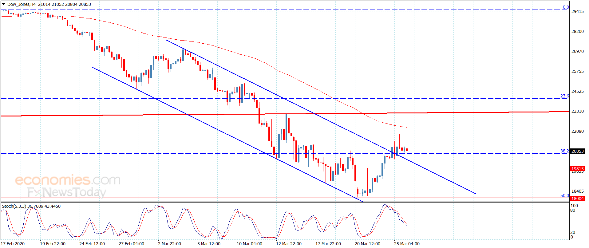 استغل سعر المؤشر اندفاعه فوق مقاومة القناة الهابطة والمستقرة عند 20600 لنلاحظ تسجيله لبعض الأهداف الإيجابية بوصوله نحو 21885, الارتداد السلبي الحالي يؤول للضغوط السلبية الناتجة عن تسلل مؤشر ستوكاستيك دون مستوى 50 ليختبر بذلك مستوى 20745.