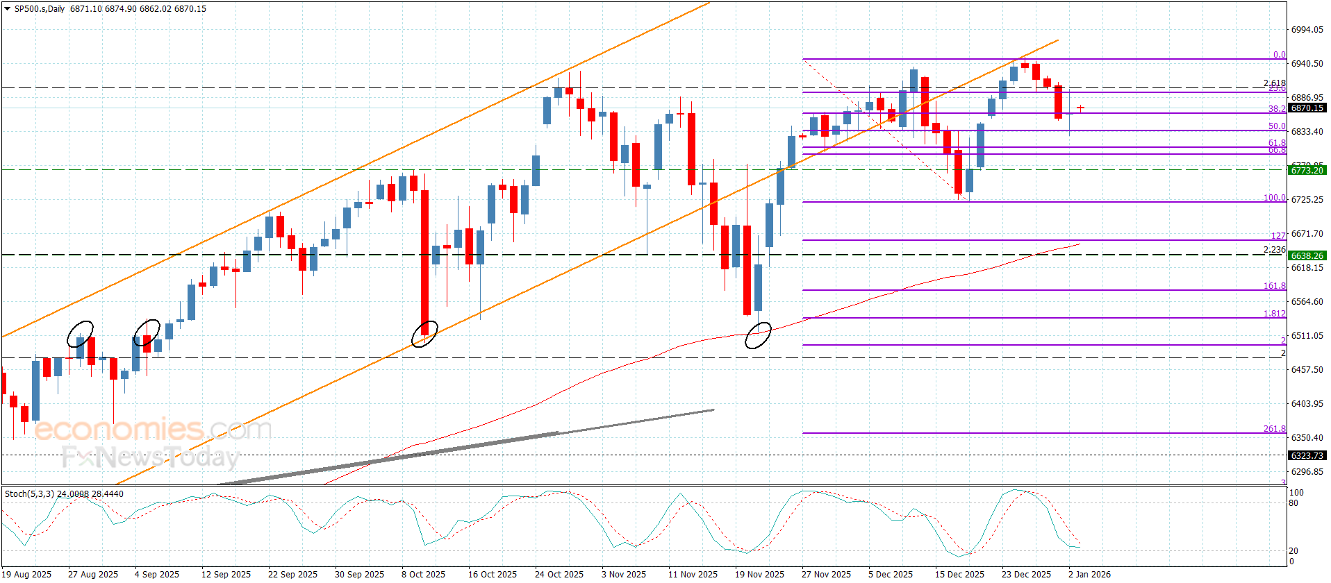 لامس سعر المؤشر بهبوطه التصحيحي الأخير مستوى 6825.00 والذي يتمركز قرب مستوى تصحيح 50% فيبوناتشي من الاندفاع الصاعد الأخير ليشكل بدوره دعم إضافي مهم وليمكنه من تعويض بعض الخسائر باندفاعه نحو 6870.00.