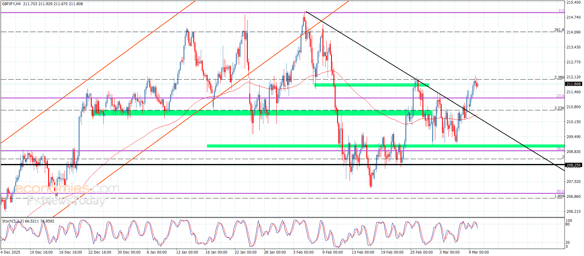 استغل سعر الزوج استمرار تشكيل مستوى 210.50 للدعم الإضافي لنلاحظ تشكيله يوم أمس للعديد من الموجات الصاعدة ليحقق بذلك الهدف الإيجابي الأول بملامسته لمستوى 212.20.