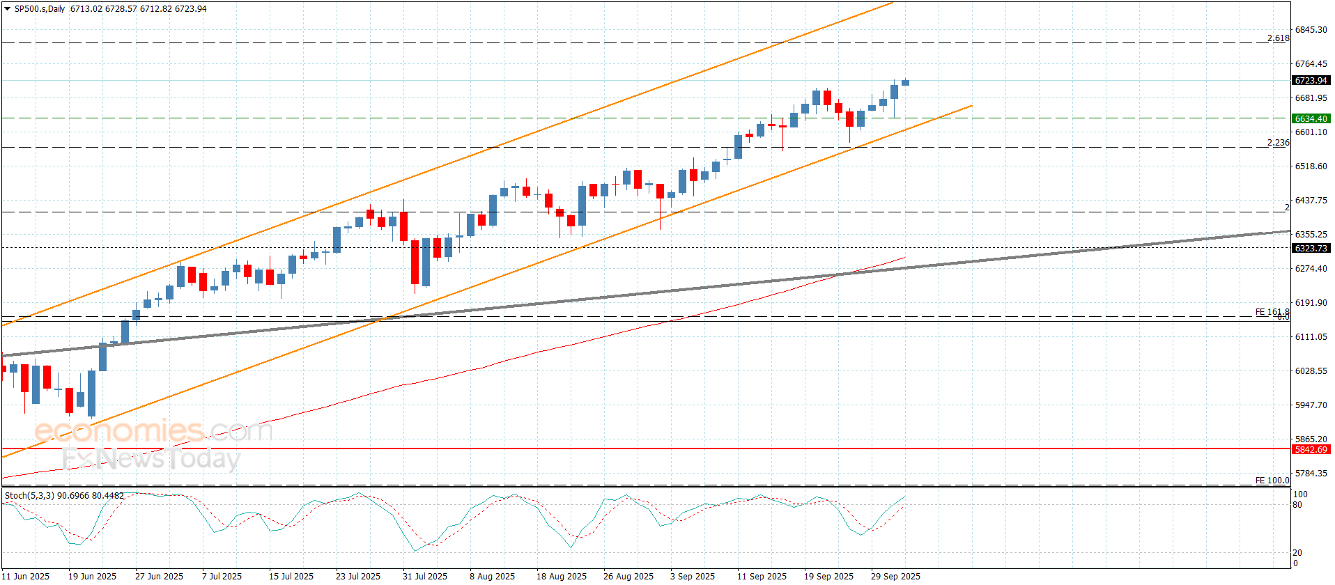 استغل سعر المؤشر الثبات العام ضمن محاور القناة الصاعدة بالإضافة لتشكيل مستوى 6635.00 للدعم الإضافي لنلاحظ تفاعله يوم أمس مع إيجابية مؤشر ستوكاستيك بتشكيله لاندفاع صاعد قوي متجاوزا بذلك القمة السابقة المتمثلة بمستوى 6705.00 وتسجيله لمكاسب تاريخية جديدة باستقراره قرب 6728.00.