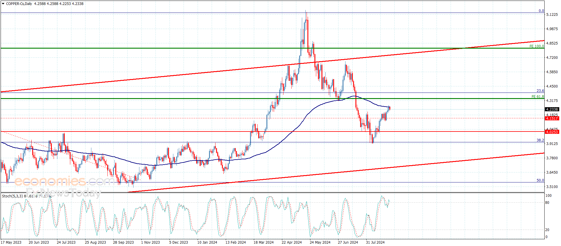 فشل سعر النحاس بتجاوز المتوسط المتحرك 55 ليستمر ذلك بتشكيل عائق قوي عند 4.2600$ لنلاحظ بدء تشكيله لموجه سلبية ليتأثر بتقديم مؤشر ستوكاستيك للعزم السلبي بخروجه حاليا من مستوى تشبع الشراء.