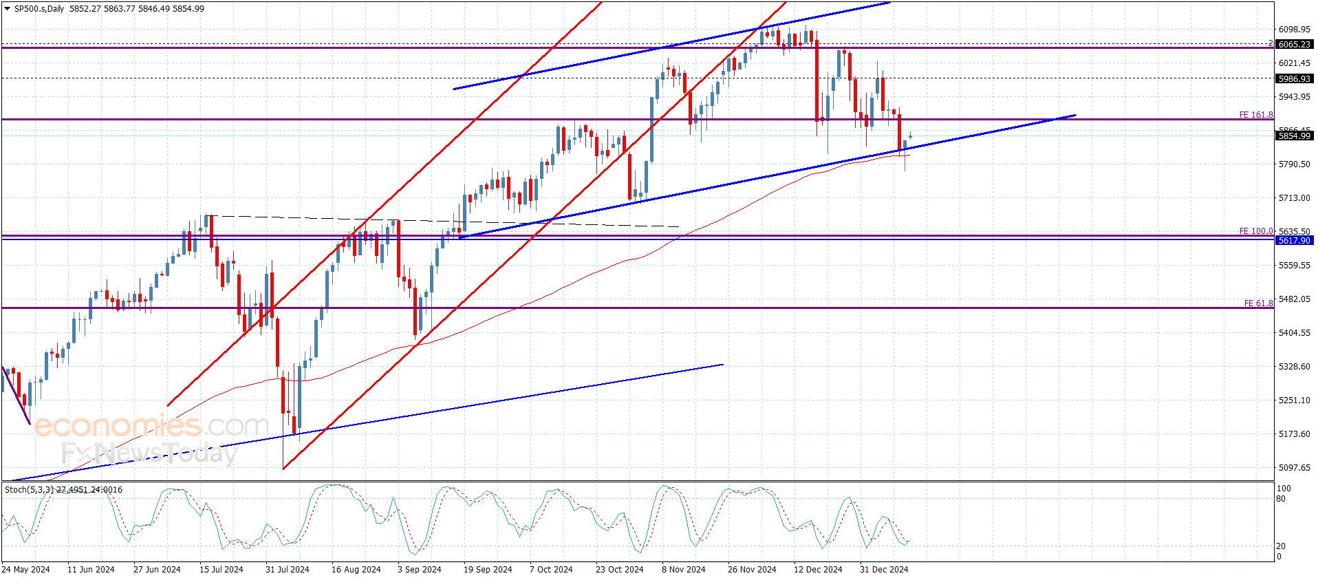 اقترب سعر المؤشر يوم أمس من الهدف السلبي الأول المتمركز عند 5755.00 ومن ثم ليشكل ارتداد صاعد سريع ليستقر من خلاله فوق دعم القناة الصاعدة المكسور والمتمثل بمستوى 5820.00 محاولا استعادة الميل الصاعد من جديد.