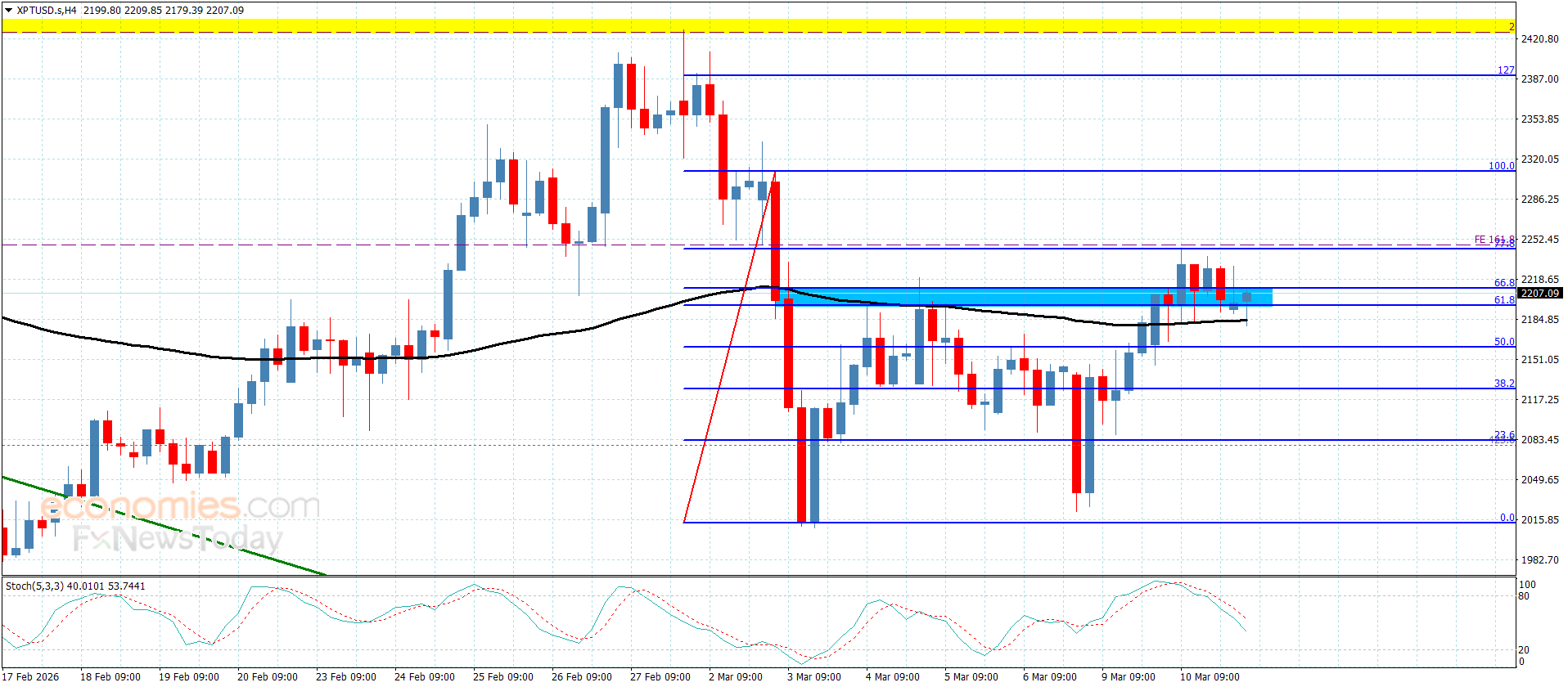 حاليا وبمحاولة تقديم مؤشر ستوكاستيك للعزم السلبي الإضافي بتسلله دون مستوى 50 سيدعم فرص تجديد السعر للمحاولات التصحيحية بتسلله أولا دون 2180.00$ ومن ثم ليبدأ باستهداف المحطات السلبية المستقرة قرب 2160.00$ و2125.00$ على التوالي.