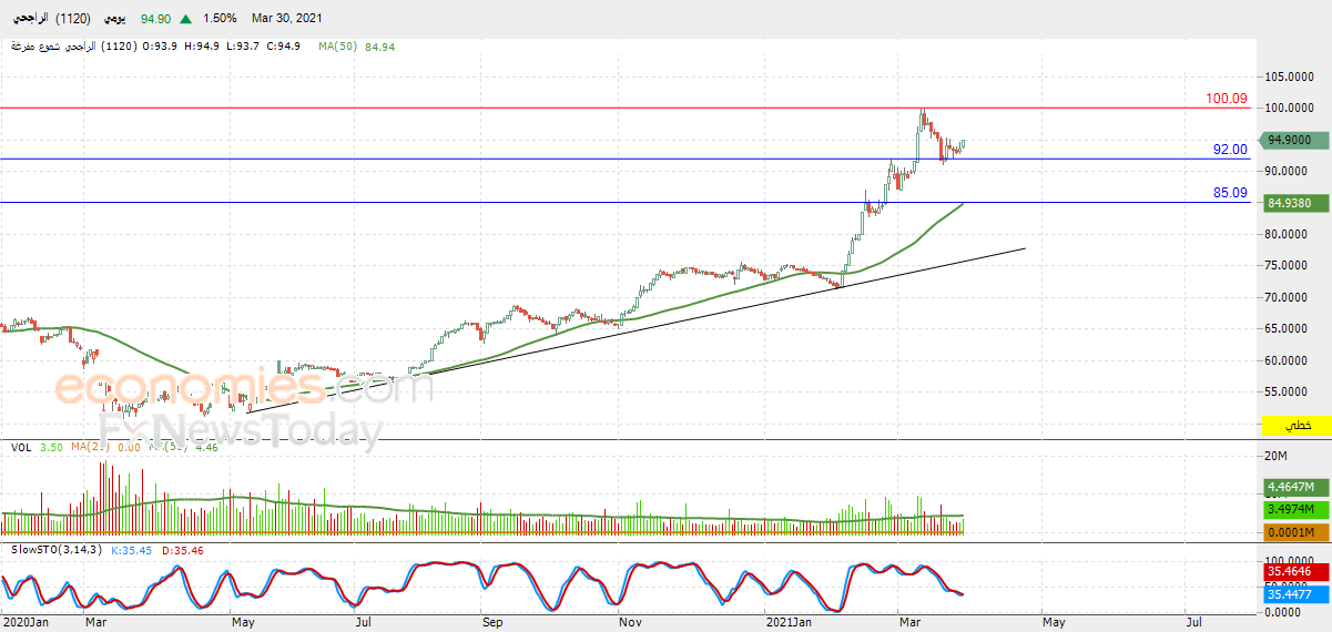 صعد سهم الراجحي (1120) في آخر جلساته، وسط سيطرة الاتجاه الرئيسي الصاعد على المدى المتوسط والقصير، وبدعم إيجابي متواصل لتداولاته اعلى متوسطه المتحرك البسيط لفترة 50 يوماً السابقة، ليحقق السهم مكاسب بلغت نسبتها 1.50% بما يعادل 1.40 نقطة، كما نلاحظ وسط ذلك وصول مؤشرات القوة النسبية لمناطق تشبع بيعي مبالغ فيها مقارنة بحركة السهم.
