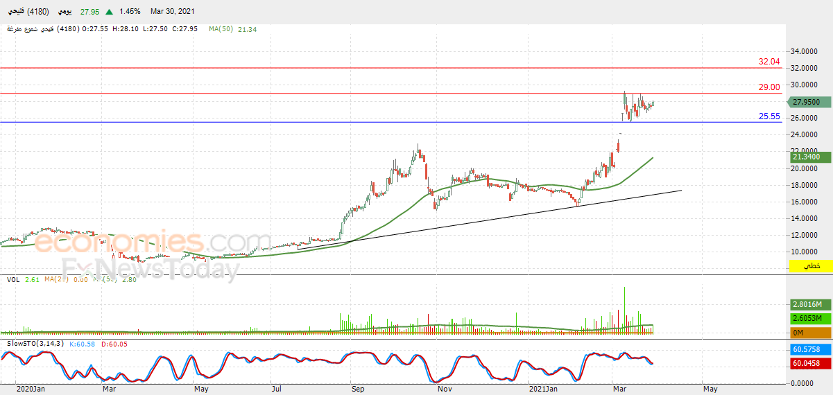 نطاق التداول المتوقع لهذا اليوم ما بين مستوى الدعم 26.00 ومستوى المقاومة 29.00.
