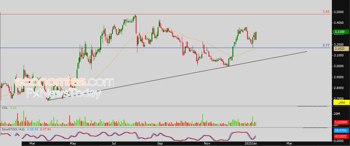 لذلك نحن نتوقع المزيد من الصعود لسعر السهم خلال تداولاته القادمة، طيلة ثبات مستوى الدعم 3.17 ريال، ليستهدف مستوى المقاومة المحوري 3.48 ريال.