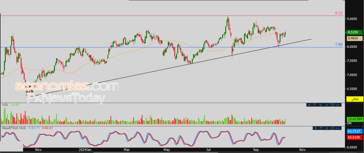 لذلك تشير توقعاتنا إلى المزيد من الصعود لسعر السهم خلال تداولاته القادمة، طيلة ثبات مستوى الدعم 8.00، ليستهدف مستوى المقاومة المحوري 9.12.