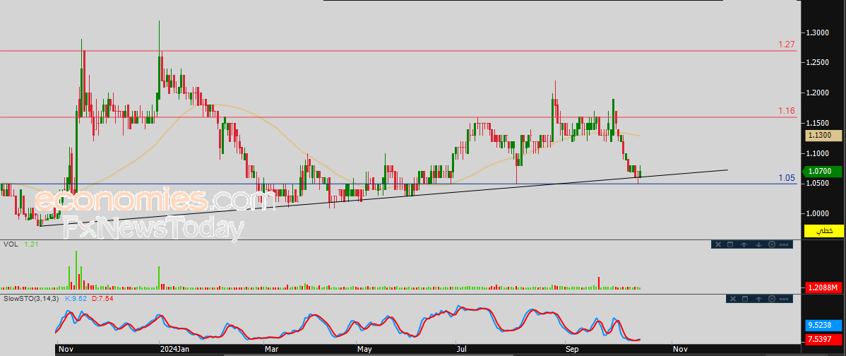 لذلك نحن نتوقع المزيد من الصعود لسعر السهم خلال تداولاته القادمة، طيلة ثبات مستوى الدعم 1.05، ليستهدف مستوى المقاومة 1.16.
