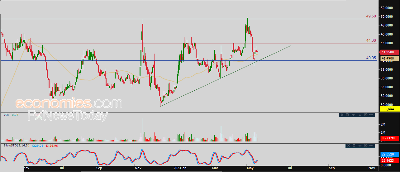 لهذا تشير توقعاتنا إلى ترجيح سيناريو عودة ارتفاع السهم خلال تداولاته القادمة، بشرط ثبات مستوى الدعم 40.00، ليستهدف مستوى المقاومة القريب 44.00 استعداداً لمهاجمته.