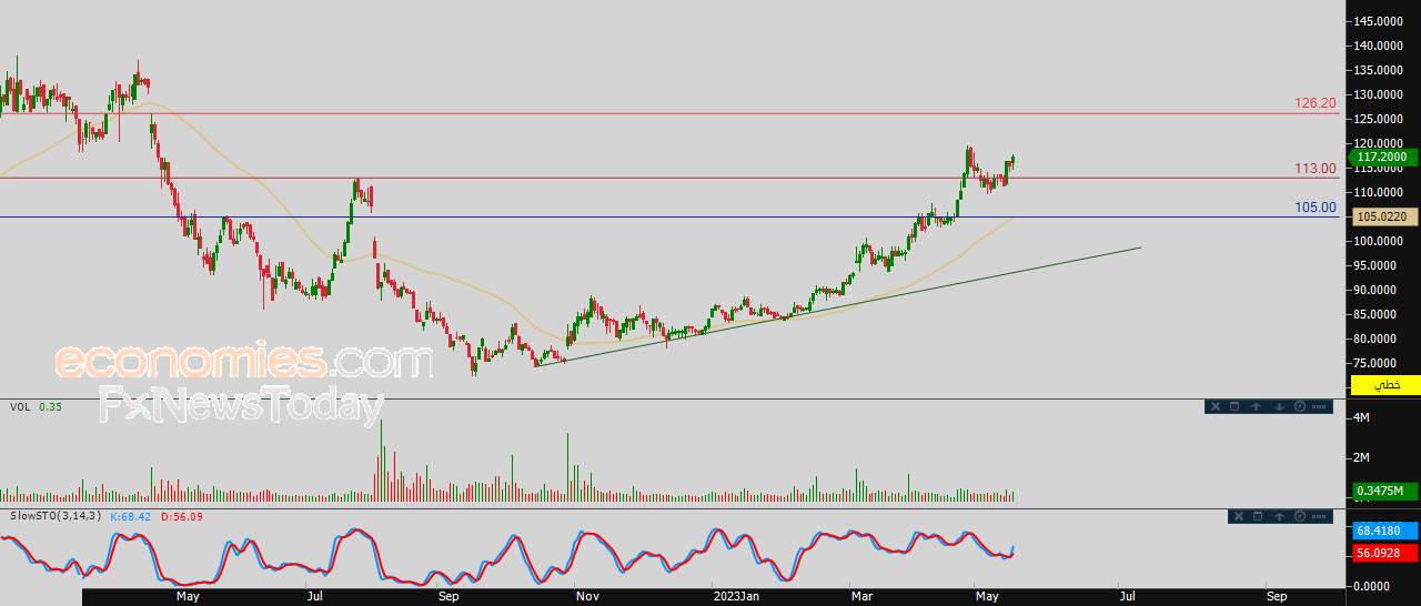 لذلك تشير توقعاتنا إلى المزيد من الصعود للسهم خلال تداولاته القادمة، خاصة طوال استقراره فوق مستوى 113.00، ليستهدف أولى مستويات المقاومة عند 126.20.