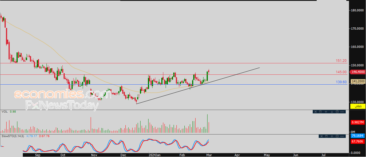 لذلك تشر توقعاتنا إلى ترجيح سيناريو عودة ارتفاع السهم خلال تداولاته القادمة، خاصة طيلة استقراره فوق مستوى 145.00، ليستهدف أولى مستويات المقاومة عند سعر 151.20 ريال.