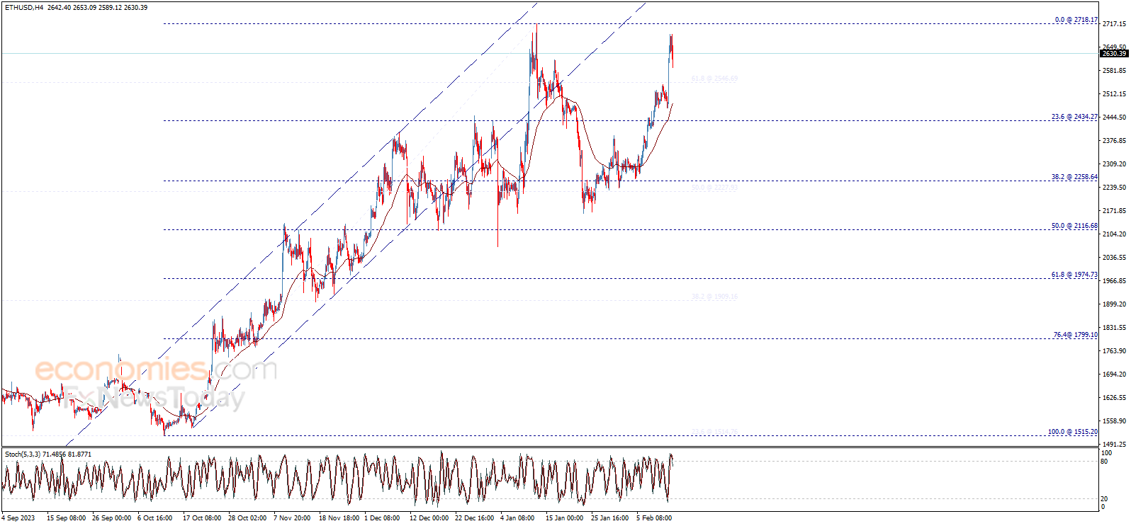 يتداول سعر الإيثريوم (ETHUSD) بسلبية ليقدّم إشارات على تشكّل قمة منخفضة قد تجبر السعر على التحوّل إلى الانخفاض، مما يتطلب الانتباه من التداولات القادمة، حيث إن مواصلة الانخفاض وكسر 2600.00 سيدفع السعر لتحقيق مزيد من الميل الهابط والتوجه نحو مستوى الدعم الأهم للتداولات اللحظية وقصيرة الأمد عند 2434.27.