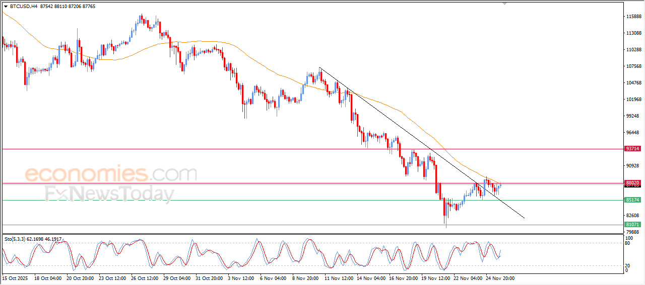 ارتفع سعر البتكوين (BTCUSD) خلال تداولاته الأخيرة على المستويات اللحظية، مدفوعاً بتوارد الإشارات الإيجابية من مؤشرات القوة النسبية، بعدما تمكن السعر من التخلص من تشبعه الشرائي بشكل تدريجي، كما يستفيد البتكوين من اختراقه السابق لخط اتجاه فرعي هابط على المدى القصير، وهو ما أعطى دفعة فنية إضافية تدعم استمرار تحركاته الإيجابية.