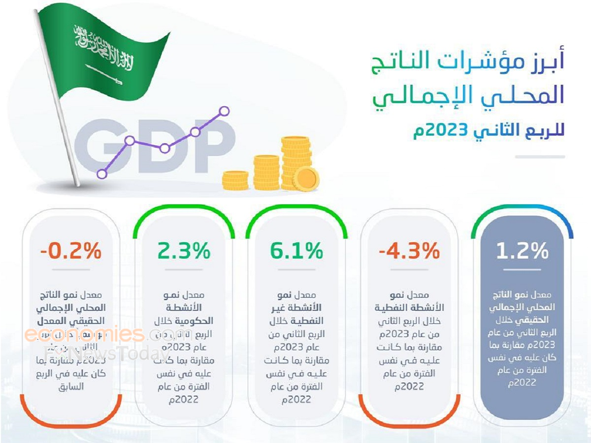 سجل الناتج المحلي الحقيقي للمملكة العربية السعودية ارتفاعا نسبته 1.2%، في الربع الثاني من عام 2023، مقارنة بالفترة نفسها من العام الماضي، بدعم الأنشطة غير النفطية.