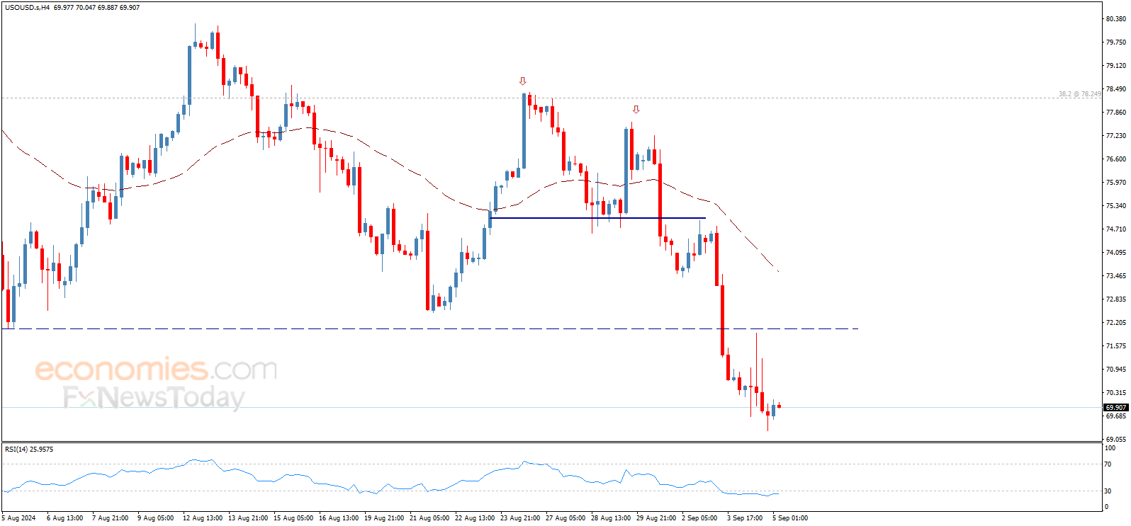 قدّم سعر النفط تداولات سلبية إضافية يوم أمس ليقترب من هدفنا الأول المنتظر عند 69.05$، ونلاحظ أن السعر اختبر حاجز 70.00$ وارتكز عليه ليبدأ بالانخفاض من جديد الآن، بانتظار استئناف الموجة الهابطة التي يمتد هدفها التالي ليصل إلى مناطق 67.65$.