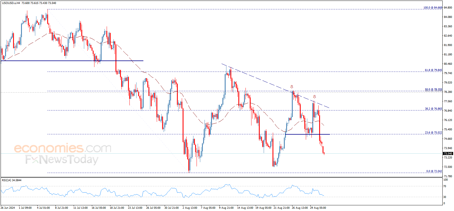 يبدأ سعر النفط تداولات اليوم بسلبية ملحوظة ليتجاوز حاجز 74.00$ ويؤكد استمرار سيطرة الاتجاه الهابط على المدى اللحظي، فاتحاً الطريق أمام التوجه نحو القاع المسجّل مؤخراً عند 72.04$ كهدف رئيسي تالي.