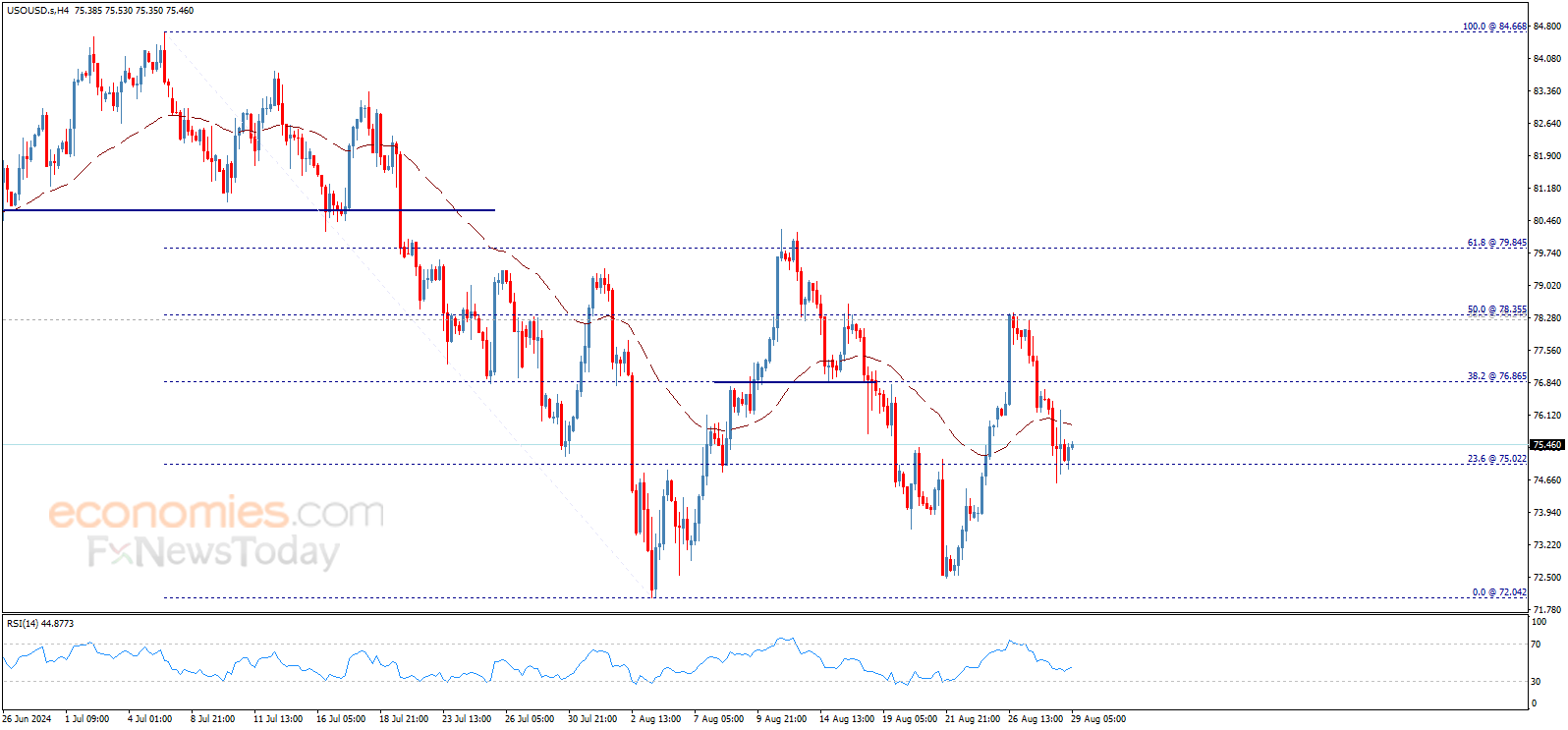 يتذبذب سعر النفط عند الدعم المحوري 75.00$ ويجد حاجز قوي هناك، بانتظار الحصول على حافز سلبي يساهم بدفع السعر لكسر هذا المستوى وفتح الطريق أمام الاندفاع لتحقيق أهداف سلبية جديدة تبدأ عند 73.85$ وتمتد لتصل إلى القاع المسجّل مؤخراً عند 72.04$.