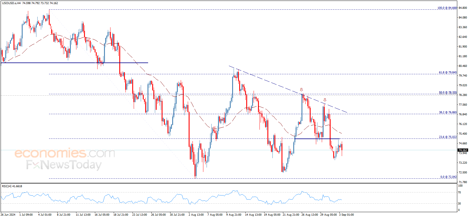 يستأنف سعر النفط تداولاته السلبية بعد اختبار مستوى 75.00$ في الجلسات الماضية، مما يدعم التوقعات بسيطرة الاتجاه الهابط اليوم، بانتظار التوجه نحو 72.04$ الذي يمثّل هدفنا الرئيسي التالي.