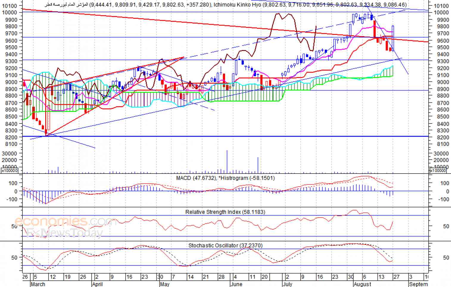 تمكن المؤشر من الارتفاع بقوة خلال جلسة أمس الاثنين، حيث اغلق عند مستوى 9802 نقطة، محققا مكاسب بلغ 3.78% مقارنة باغلاقه السابق، ليتجاوز بذلك مستوى مقاومته عند 9650 نقطة، وبالتزامن مع تمكن المؤشر من تجاوز خط "Kijun Sen " وهو احد خطوط مؤشر "Ichimoku Cloud" مما يشير الى ان المؤشر قد يواصل ارتفاعه لمستويات أعلى قد تصل الى 10000 نقطة، شرط ثبات المؤشر أعلى مستوى 9600 نقطة.