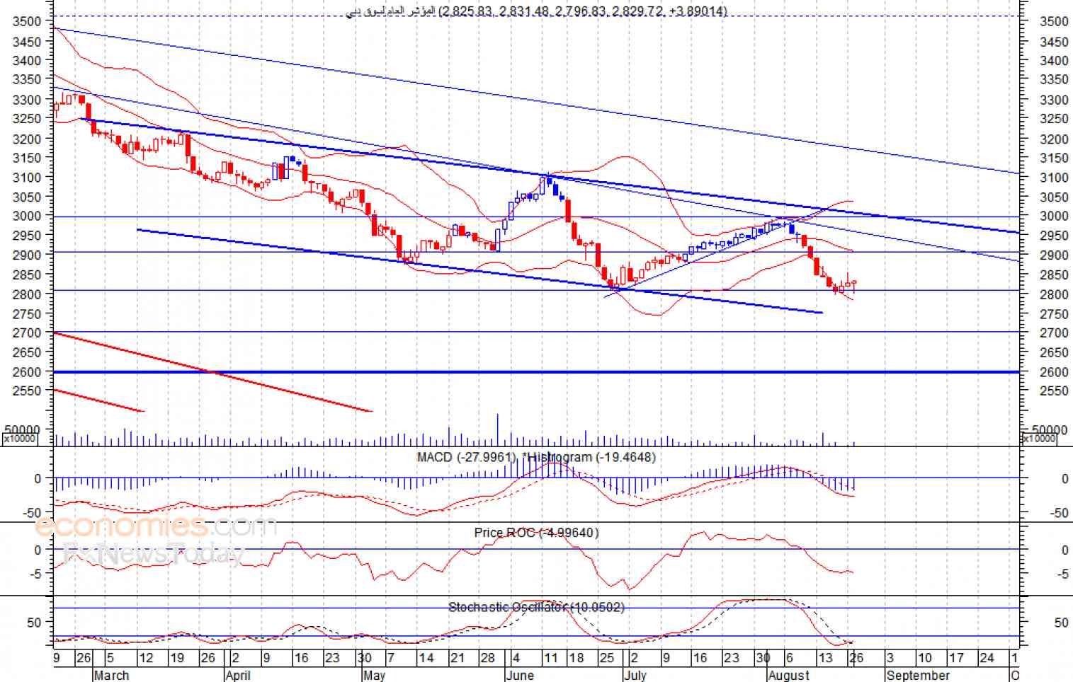 وض المؤشر خسائره التي حققها خلال جلسة أمس الاثنين، حيث استهل الجلسة عند مستوى 2825 نقطة، ثم انخفض مسجلا مستوى 2796 نقطة، ملامسا عنده مستوى الدعم الحالي عند 2800 نقطة، والذي ساهم في دفع المؤشر لأعلى ليغلق عند مستوى 2829 نقطة، وهو أعلى مستوى يصل اليه المؤشر خلال الجلسة، وفي ظل ظهور انحراف إيجابي على مؤشر "Macd-Histrogram " لذلك نتوقع ان يرتد المؤشر لأعلى لمستوى المقاومة القوي عند 2900 نقطة، شرط بقاء المؤشر أعلى مستوى 2800 نقطة.