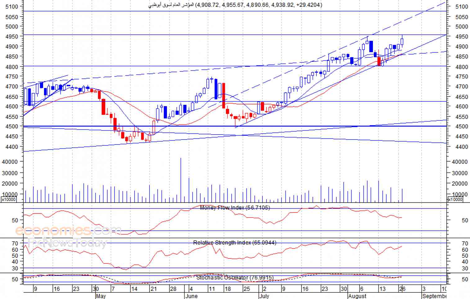 مدد المؤشر من مكاسبه كما أشرنا في تقاريرنا السابقة، حيث اغلق أمس الاثنين مرفعا عند مستوى 4938 نقطة، ملامسا لهدفه السعري المتوقع عند مستوى 4950 نقطة، وفي ظل ارتفاع في قيمة التداول، وهو ما يعد إشارة إيجابية، لذلك نتوقع انه في حالة تمكن المؤشر من تجاوز هذا المستوى، فانه سيواصل ارتفاعه لمستوى مقاومته التالي عند 5070 نقطة.