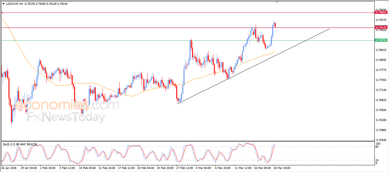 تراجع قليلاً سعر الدولار مقابل الفرنك السويسري (USDCHF) خلال تداولاته اللحظية الأخيرة، ليجني الزوج أرباح ارتفاعاته السابقة، وليحاول اكتساب زخماً إيجابياً قد يساعده على التعافي والصعود من جديد، بالإضافة إلى ذلك يحاول الزوج تصريف البعض من تشبعه الشرائي الواضح بمؤشرات القوة النسبية، خاصة مع بدء ظهور تقاطع سلبي بها، وذلك بعد تخطي الزوج لهدفنا السعري الأخير عند المقاومة 0.7910، في ظل استمرار الدعم الديناميكي المتمثل في تداولاته أعلى متوسطه المتحرك البسيط لفترة 50، والذي يعزز من استقرار وهيمنة الاتجاه الرئيسي الصاعد على المدى القصير، مع تحركاته بمحاذاة خط ميل فرعي داعم له.