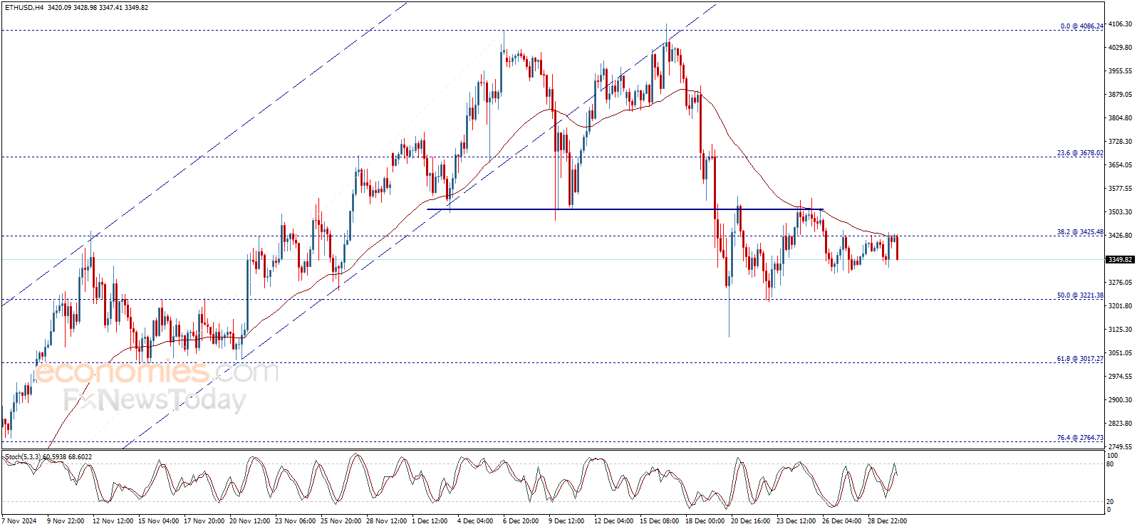 ترتد تداولات سعر الإيثريوم (ETHUSD) هبوطاً بعد اختبار مستوى 3425.50$، ونلاحظ أن مؤشر ستوكاستيك يتقاطع بشكل سلبي ليعزز فرص مواصلة الانخفاض بقية اليوم، مع التذكير بأن أهدافنا المنتظرة تبدأ عند 3222.00$ وتمتد إلى 3017.30$ بعد كسر المستوى السابق، بينما يتطلب تحقيقها الثبات دون مستويات 3425.50$ والأهم دون 3510.00$.