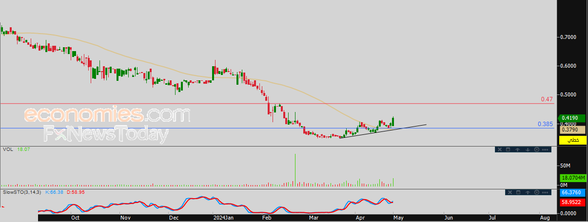 لهذا تشير توقعاتنا إلى المزيد من الصعود التصحيحي لسعر السهم خلال تداولاته القادمة، طيلة استقراره فوق مستوى 0.385، ليستهدف مستوى المقاومة 0.47.