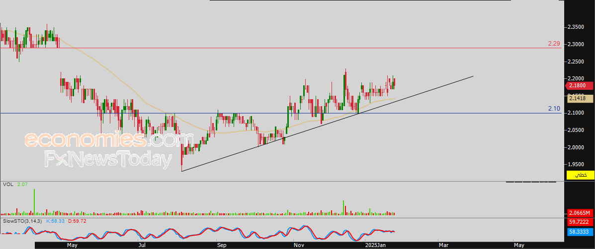 لهذا فتوقعاتنا ترجح عودة صعود سعر السهم خلال تداولاته القادمة، طيلة ثبات مستوى الدعم 2.10 درهم، ليستهدف مستوى المقاومة 2.29 درهم.