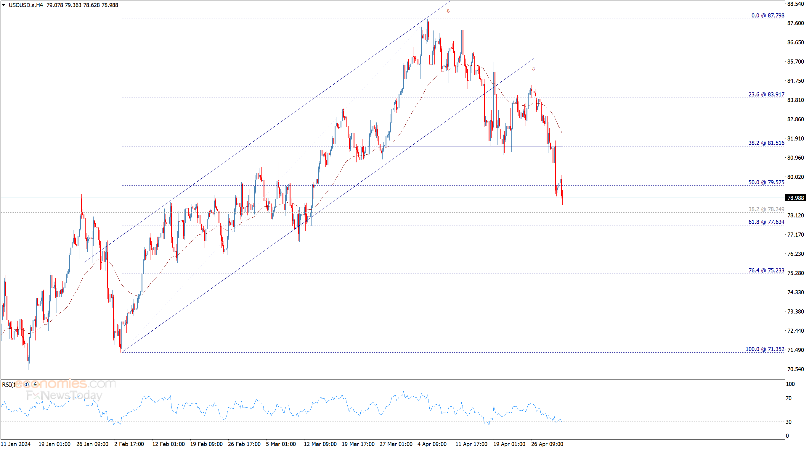 يستأنف سعر النفط تداولاته السلبية ليبتعد عن مستوى 79.60$، معززاً التوقعات باستمرار الاتجاه التصحيحي الهابط، والطريق مفتوح أمام تحقيق هدفنا التالي عند 77.65$، مع الانتباه إلى أن اختراق 79.60$ سيوقف الانخفاض المتوقع ويقود السعر لبدء محاولات تعافي على المدى اللحظي.