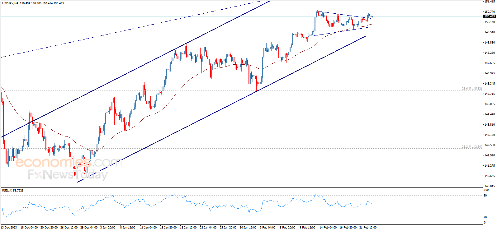 حقق زوج الدولار مقابل الين اختراقاً واضحاً لمقاومة المثلث المتماثل وأنهى تداولات يوم أمس فوقه، ليفعّل السيناريو الإيجابي على المدى اللحظي ويتجه نحو تحقيق مكاسب تبدأ باختبار مستوى 151.70.