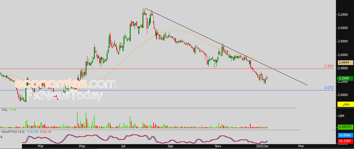لذلك نحن نتوقع انخفاض سعر السهم خلال تداولاته القادمة، طيلة ثبات مستوى المقاومة 2.394 ريال، ليستهدف أولى مستويات الدعم عند سعر 2.072 ريال.