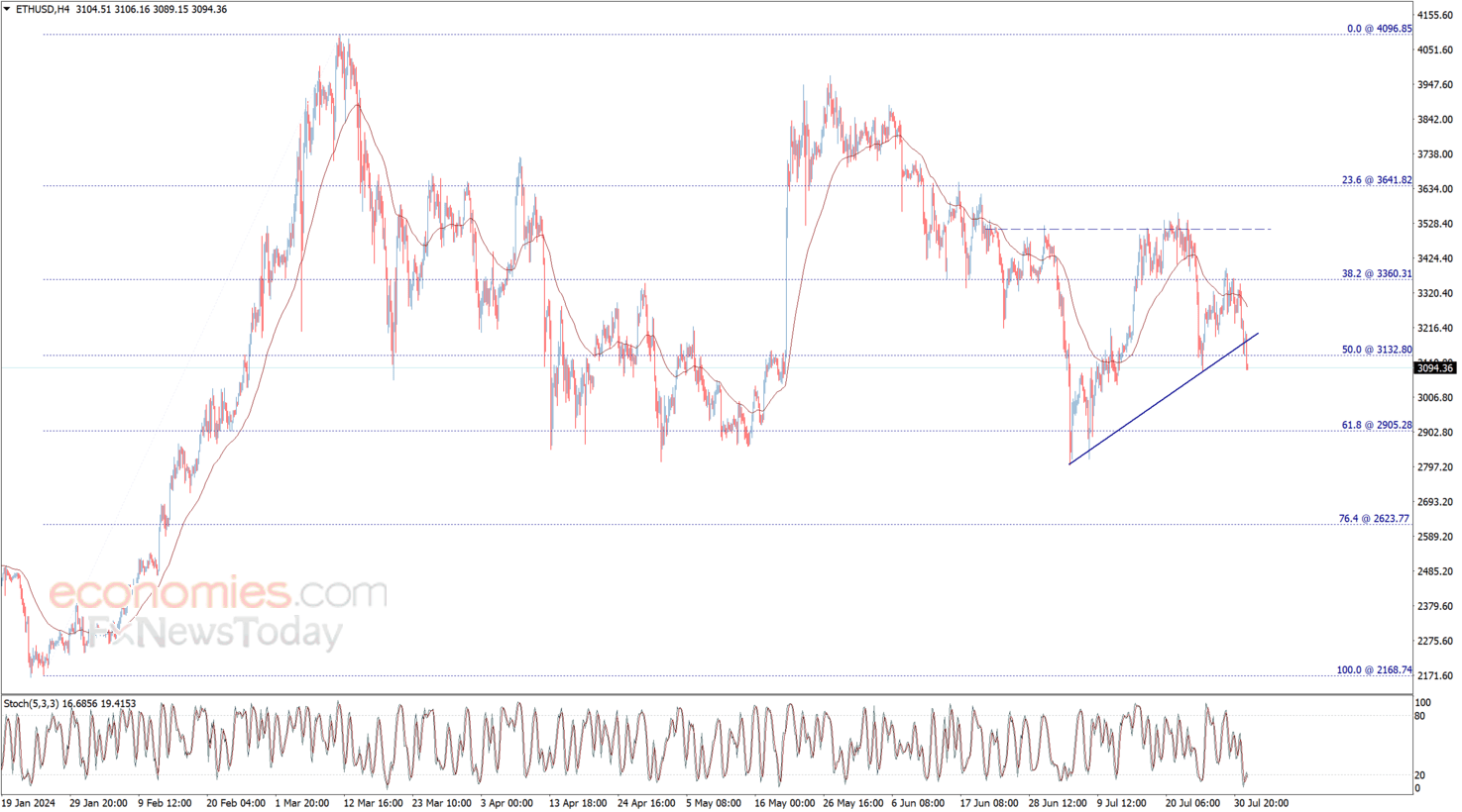 حقق سعر الإيثريوم (ETHUSD) كسراً أولياً لمستوى 3132.80$ وأغلق شمعة الأربع ساعات الأخيرة دونه، ليدعم التوقعات باستمرار سيطرة الاتجاه الهابط ويفتح الطريق أمام التوجه نحو 2905.30$ كمحطة سلبية تالية، مع الأخذ بعين الاعتبار أن اختراق 3132.80$ سيوقف الضغط السلبي الحالي ويقود السعر لمحاولة التعافي.